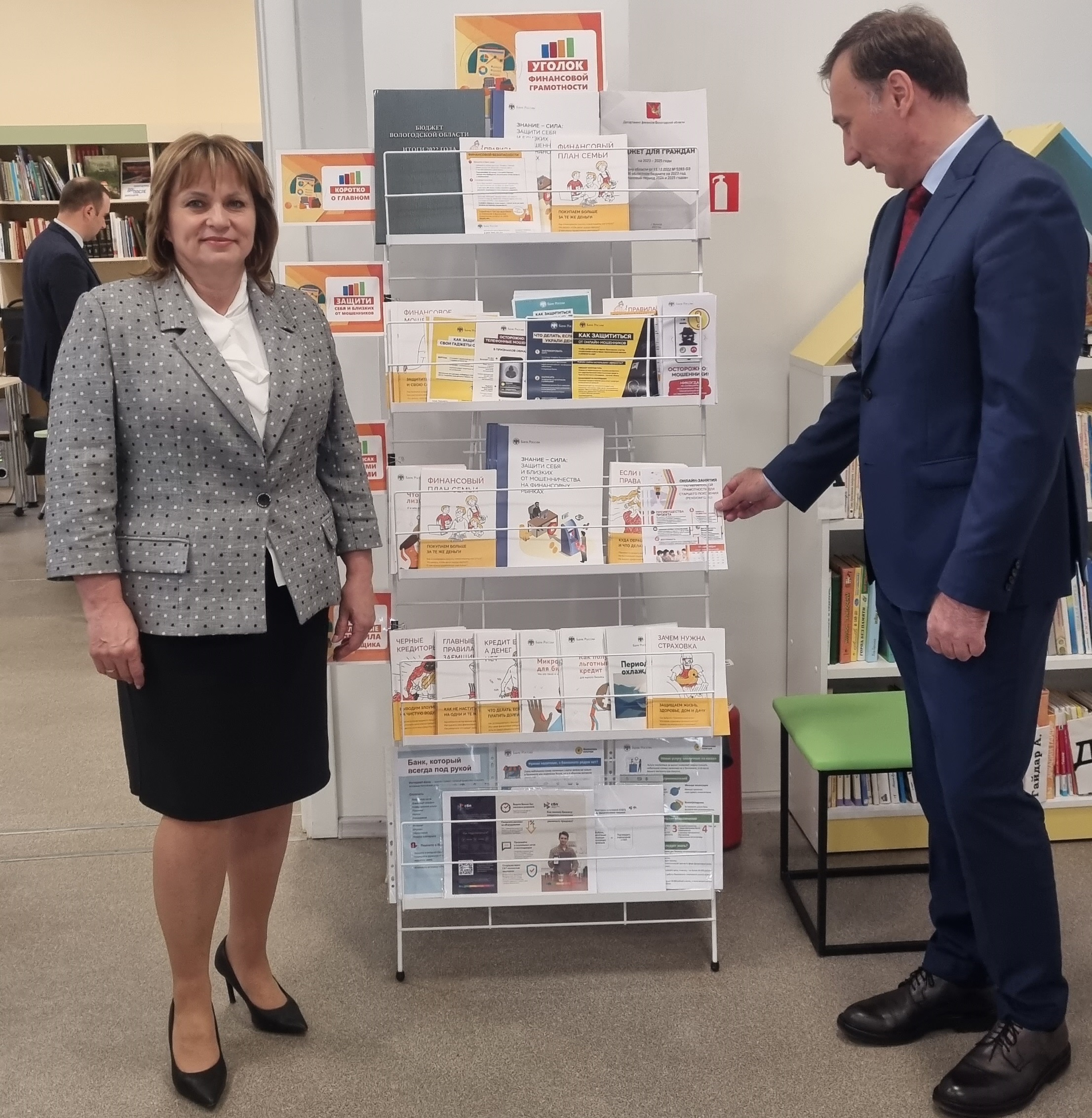 В продолжение темы финансового просвещения Татьяна Голыгина вместе с Алексеем Щербининым, управляющим Отделением Вологда Банка России, открыли уголок финансовой грамотности, материалы для которого были предоставлены Банком России, наделенным Президентом России полномочиями по повышению финансовой грамотности.