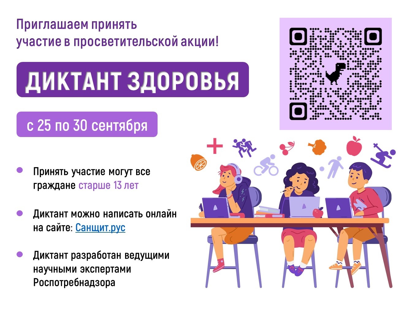 Федеральная служба по надзору в сфере защиты прав потребителей и благополучия человека в рамках реализации коммуникационной стратегии «Санпросвет» с 25 по 30 сентября 2023 года проводит образовательную просветительскую акцию «Диктант здоровья»