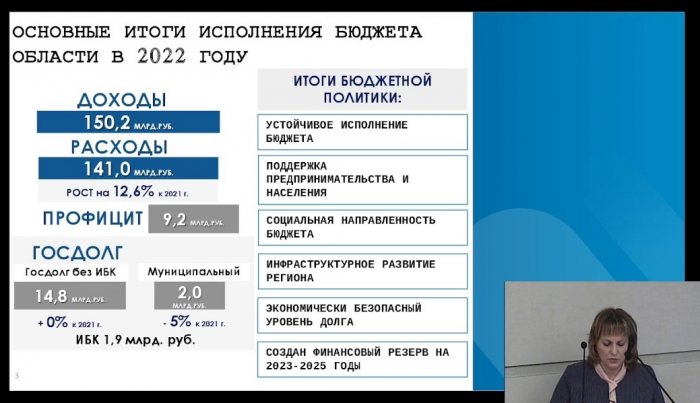 «По итогам 2022 года доходы областного бюджета превысили 150 миллиардов рублей. Расходы увеличились почти на 16 миллиардов – до 141 миллиарда рублей. Профицит составил более 9 миллиардов рублей», — заявила она.