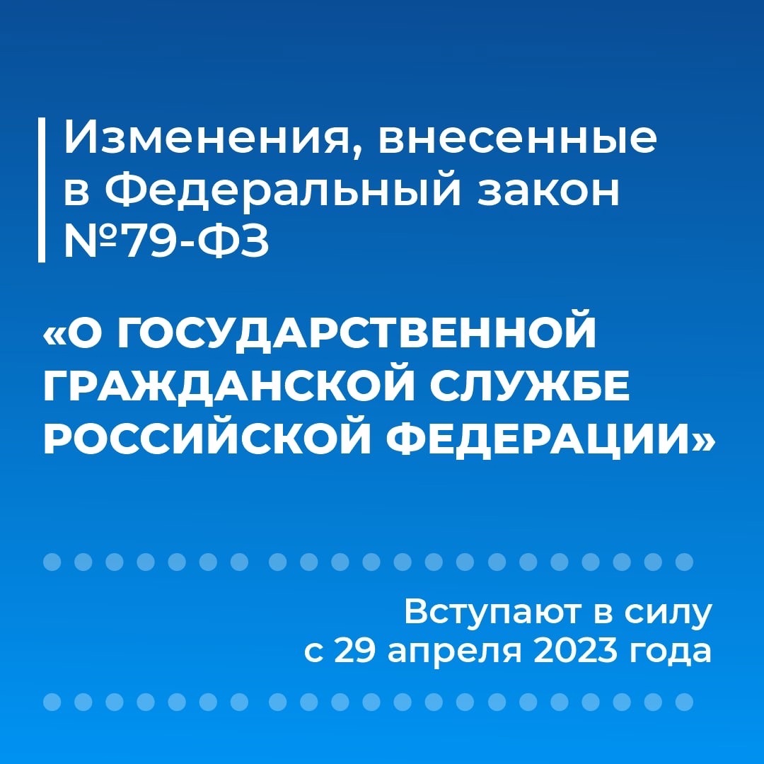 С 29 апреля 2023 года вступают в силу некоторые изменения в Федеральный закон №79-ФЗ «О государственной гражданской службе Российской Федерации». Подробнее об изменениях - в карточках⬇