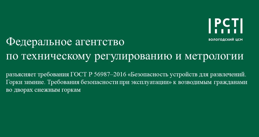 ГОСТ Р 56987–2016 «Безопасность устройств для развлечений. Горки зимние. Требования безопасности при эксплуатации» утвержден и введен в действие с 1 февраля 2017 г. приказом Росстандарта от 28 июня 2016 г. № 721-ст.