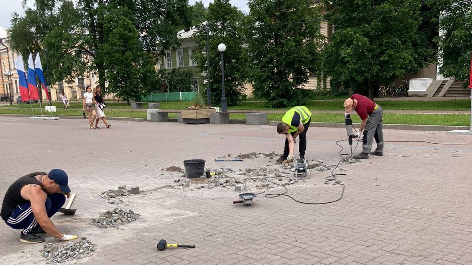 По поручению исполняющего обязанности Мэра города Вологды Андрея Накрошаева выполняется ремонт брусчатки на Кремлёвской площади ко Дню города.