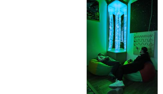 Это беговые дорожки, сенсорный уголок с воздушно-пузырьковой трубкой и пультом управления для расслабления и медитации, свето-звуковая панель, ландшафтный стол.