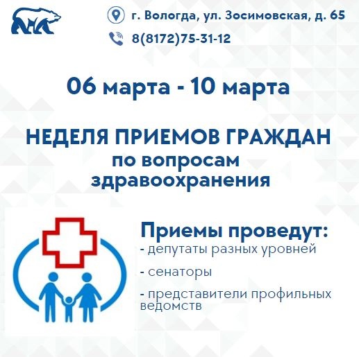 Также 6 марта прием граждан проведут депутаты Государственной Думы Валентина Артамонова (в Вологде по адресу: ул. Зосимовская, 65, с 15:00 – 16:00) и Алексей Канаев (в Череповце по адресу: ул. Сталеваров, д. 42 с 17:00 – 18:00).
