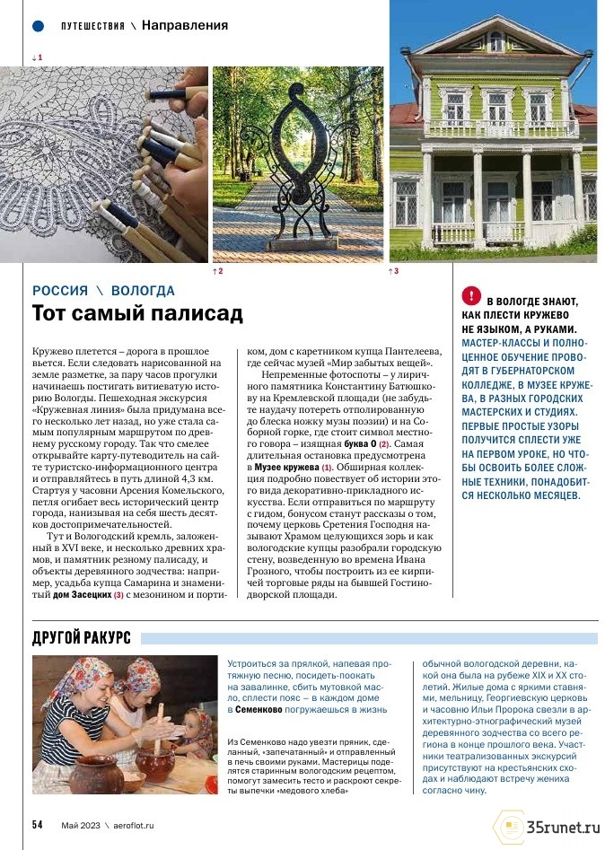 В майском номере журнала «Аэрофлот» вышла статья о Вологде и её достопримечательностях, а в рубрике «Другой ракурс» – заметка об архитектурно-этнографическом музее «Семёнково».