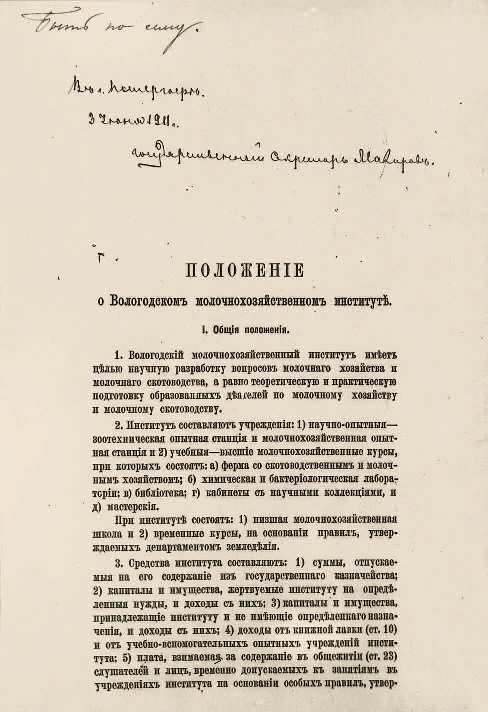 3 июня 1911 года законопроект, положение и штаты о Вологодском молочнохозяйственном институте были утверждены Императором Николаем II.