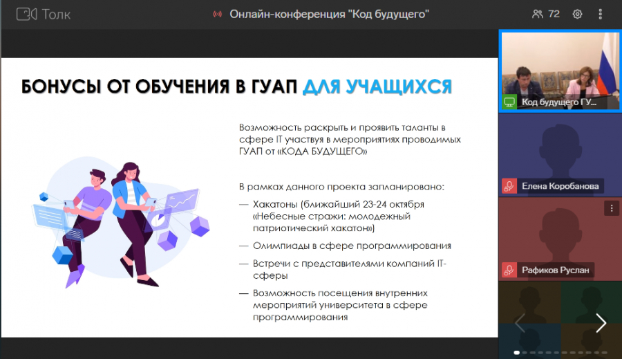 05.09.2023 года в рамках проекта «Код будущего», реализуемого в рамках федерального проекта «Развитие кадрового потенциала ИТ-отрасли» национальной программы «Цифровая экономика Российской Федерации» Велико-Устюгский филиал принял участие в онлайн-конференции по обсуждению проекта.