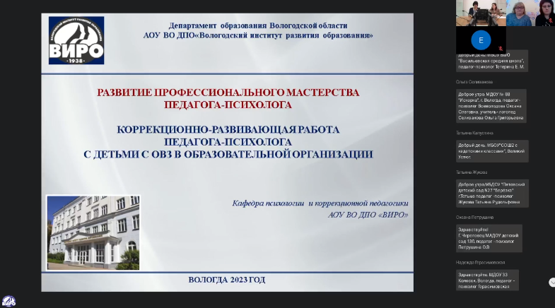 7 июня в Вологодском институте развития образования состоялся вебинар «Развитие профессионального мастерства педагога-психолога. Коррекционно-развивающая работа педагога-психолога с детьми с ОВЗ в образовательной организации». В нем приняли участие более 160 педагогов-психологов образовательных организаций Вологодской области.
