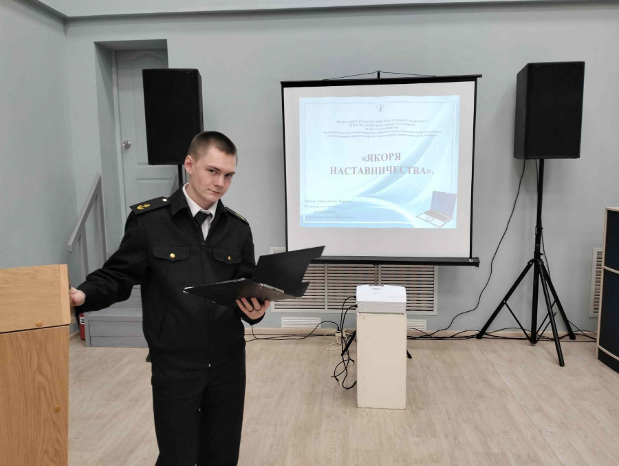 Курсант 3 курса Велико- Устюгского филиала ФГБОУ ВО «ГУМРФ им.адмирала С.О.Макарова» Никуличев Кирилл представил проект на тему " Якоря наставничества" (руководитель проекта - Е.В. Коробанова, начальник учебно-методического отдела)