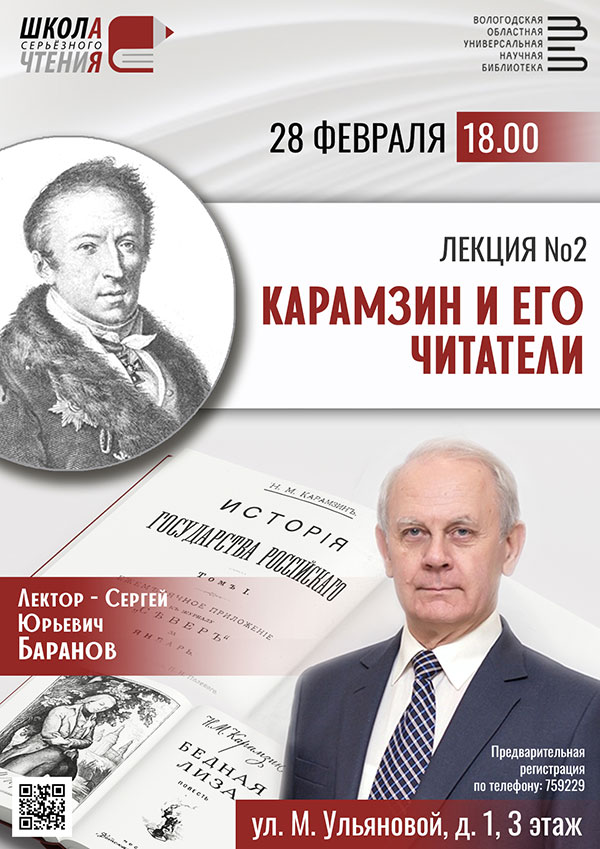 Вторая лекция цикла будет посвящена теме «Николай Карамзин и его читатели» и состоится во вторник, 28 февраля , по адресу: М. Ульяновой, 1, 3 этаж, конференц-зал.
