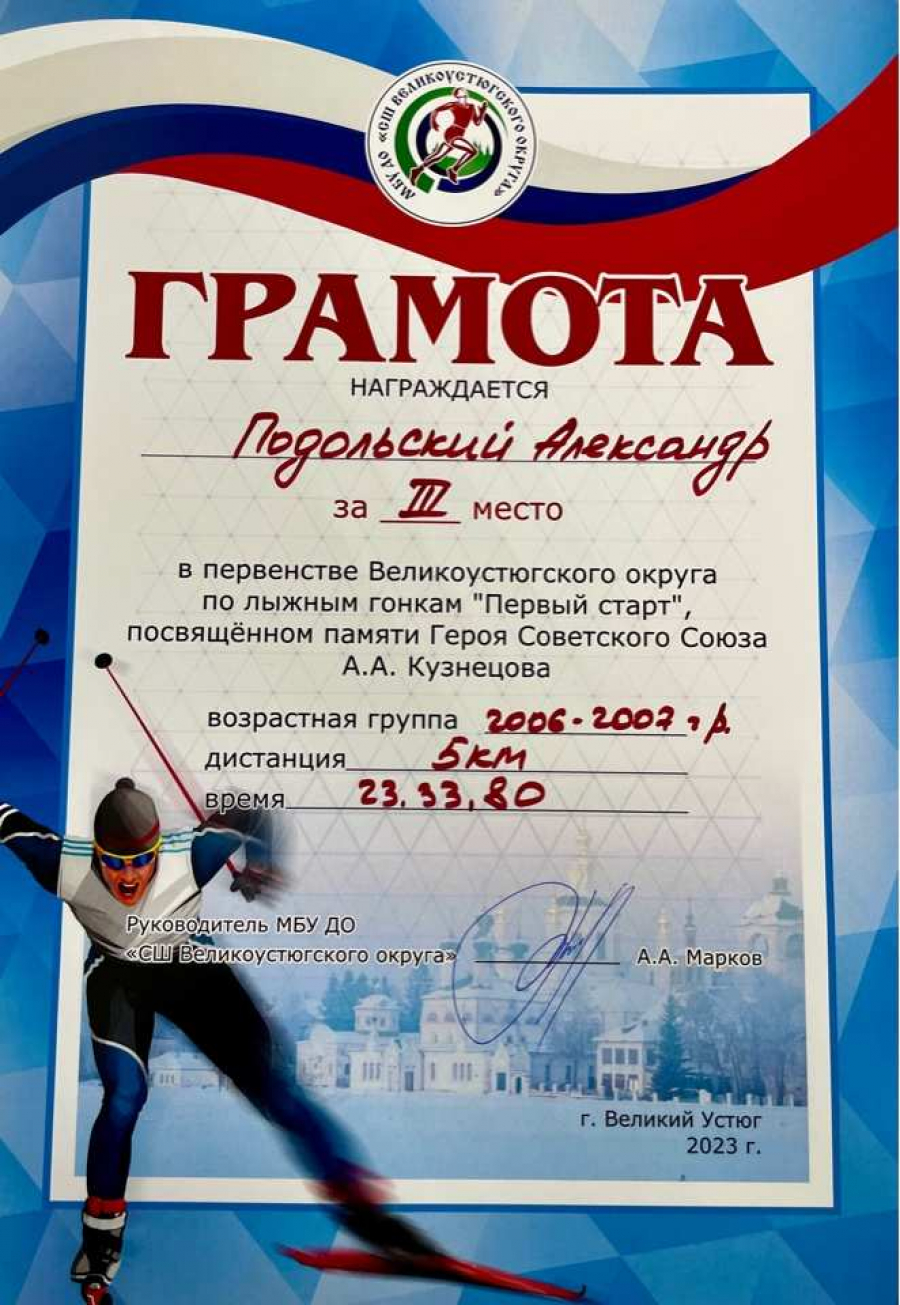 3 декабря на лыжной базе "Салют" прошли первые соревнования по лыжным гонкам в новом спортивном сезоне. От Велико-Устюгского филиала ФГБОУ ВО «ГУМРФ имени адмирала С.О. Макарова» на старт вышли Подольский Александр 21- СВ группа, Петялин Никита 14-СВ группа и Филиппов Артём 11-СВ группа. Все ребята показали хорошие результаты. Грамотой за III место награждён Подольский Александр. Поздравляем Александра и желаем удачи