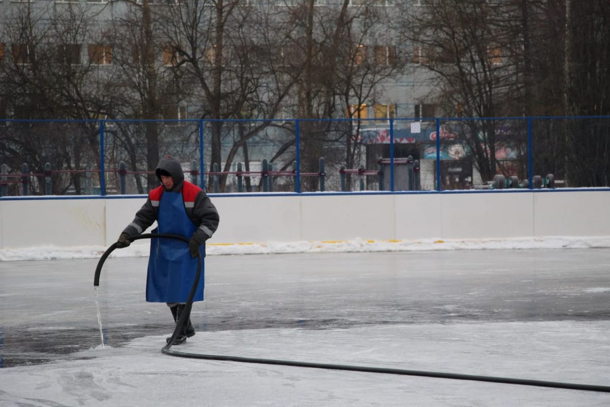Заливка льда на хоккейном корте «умной» площадки завершена, стартовали бесплатные массовые катания на улице Гагарина.