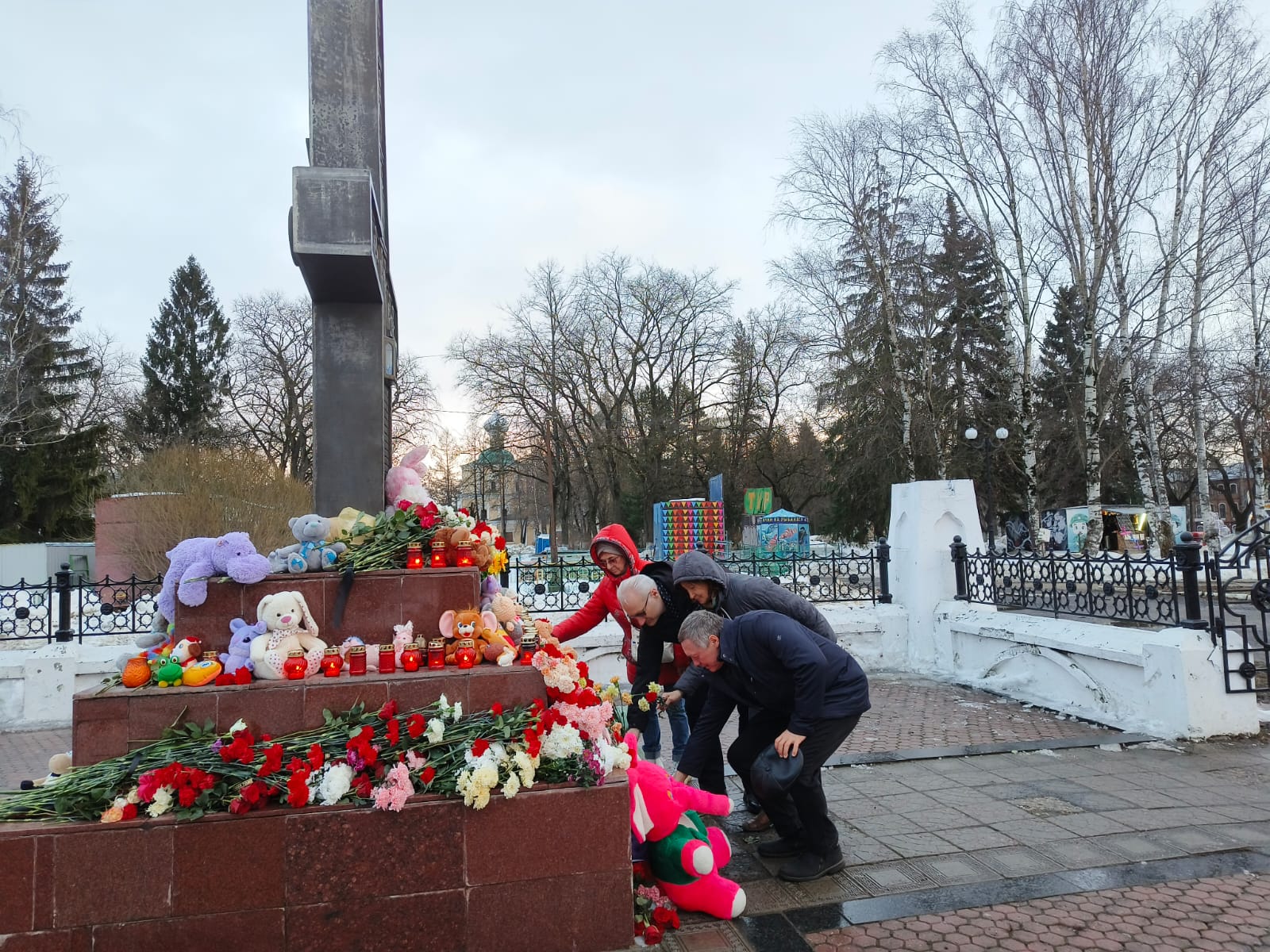 Сегодня вологжане стихийно организовали мемориал в память о погибших. Сюда приносят цветы, мягкие игрушки, лампады.