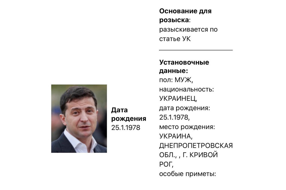 Информация об объявлении в розыск президента соседней страны появилась сегодня на сайте Министерства внутренних дел РФ. В базе розыска на сайте МВД сказано: «Владимир Александрович Зеленский, 25.1.1978. В карточке также указано место рождения президента Зеленского – г. Кривой Рог Днепропетровской области Украины.