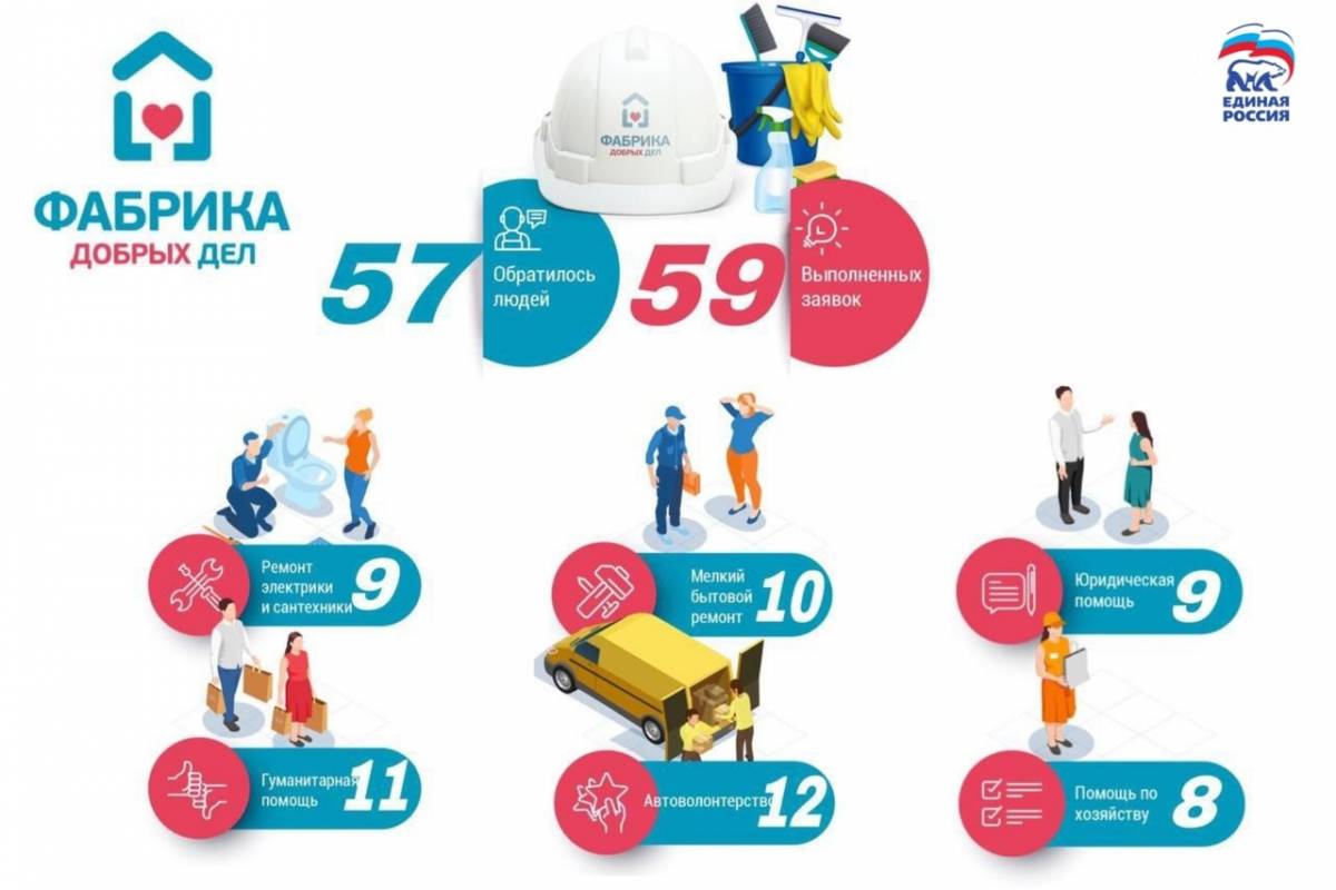 За месяц волонтёры выполнили 59 заявок, которые поступили в «Фабрику». Из них 10 заявок на мелкий бытовой ремонт, 9 - на ремонт электрики и сантехники, 8 - помощь по хозяйству. Автоволонтеры доставляли лекарства, средства личной гигиены, отвозили благополучателей по делам. Нуждающимся были переданы 11 гуманитарных наборов. Девять обратившихся были проконсультированы по юридическим вопросам. Также волонтёры торжественно поздравили восемь именинников с днем рождения.