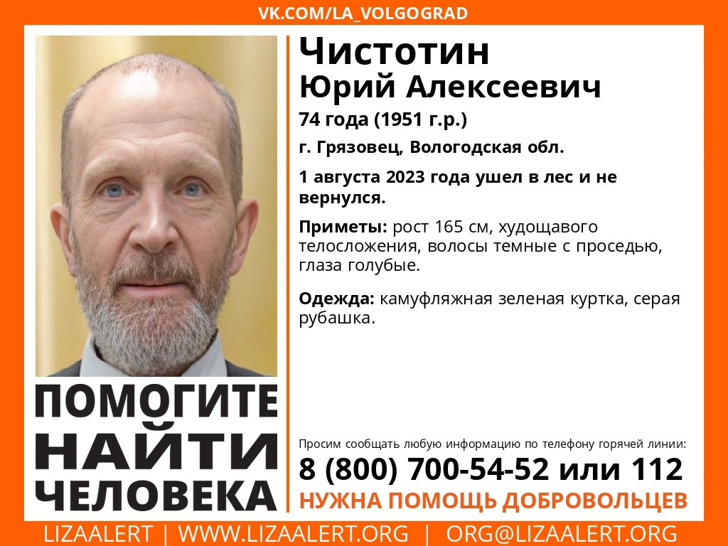 74-летний пенсионер из Вологодской области ушел в лес и не вернулся. Речь идет о жителе Грязовца Юрии Алексеевиче Чистотине.
