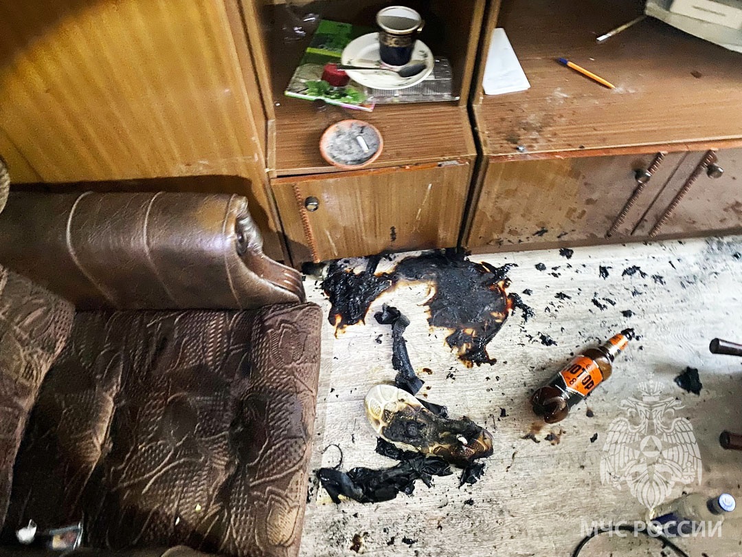 В квартире повреждено напольное покрытие. Предварительная причина возгорания — неосторожность при курении, сообщает МЧС.