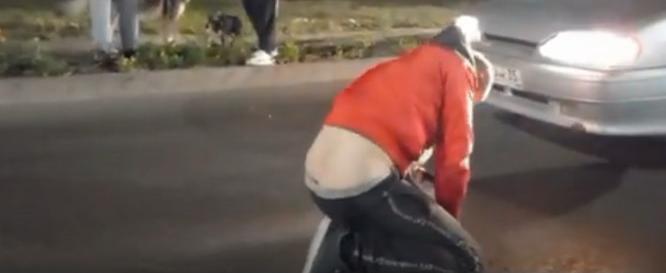 «….вблизи местного алкомаркета на улице Щетинина маргинального вида солевой этилосос пытался запрыгнуть на движущийся по проезжей части автомобиль. Водитель ВАЗ-2114, двигавшийся с минимальной скоростью, увидев, что навстречу ему по проезжей части движется качающееся из стороны в сторону «тело», в недоумении остановился. В этот момент, разбежавшись, неадекват запрыгнул на капот его автомобиля, после чего, скатившись на землю, распластался, изображая потерпевшего», - рассказал автор ролика и очевидец ЧП вологжанин Степан Сташко.