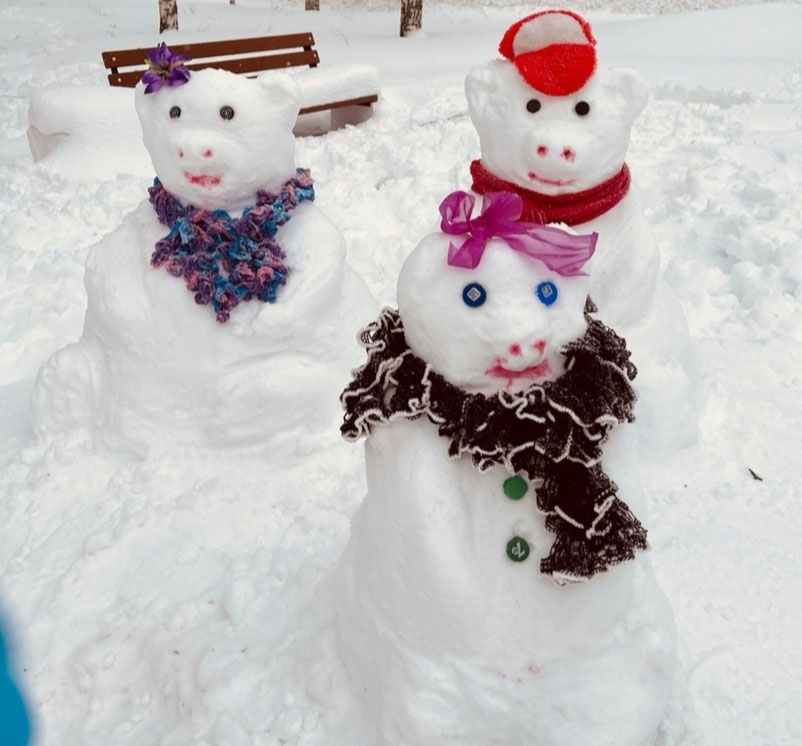 А раз 2024 год объявлен годом семьи, то и главной темой снежных скульптур стала семья. Фантазия мастеров разыгралась не на шутку. На площади теперь красуются семьи снеговиков, колобков, медведей и котов. А приглядывает за всеми одинокий дракон. Но зима еще не закончилась, так что может и у него появится дракониха с дракончиком? А еще одна фигура разместилась на дереве. Эдакий древесно-снежный заяц.