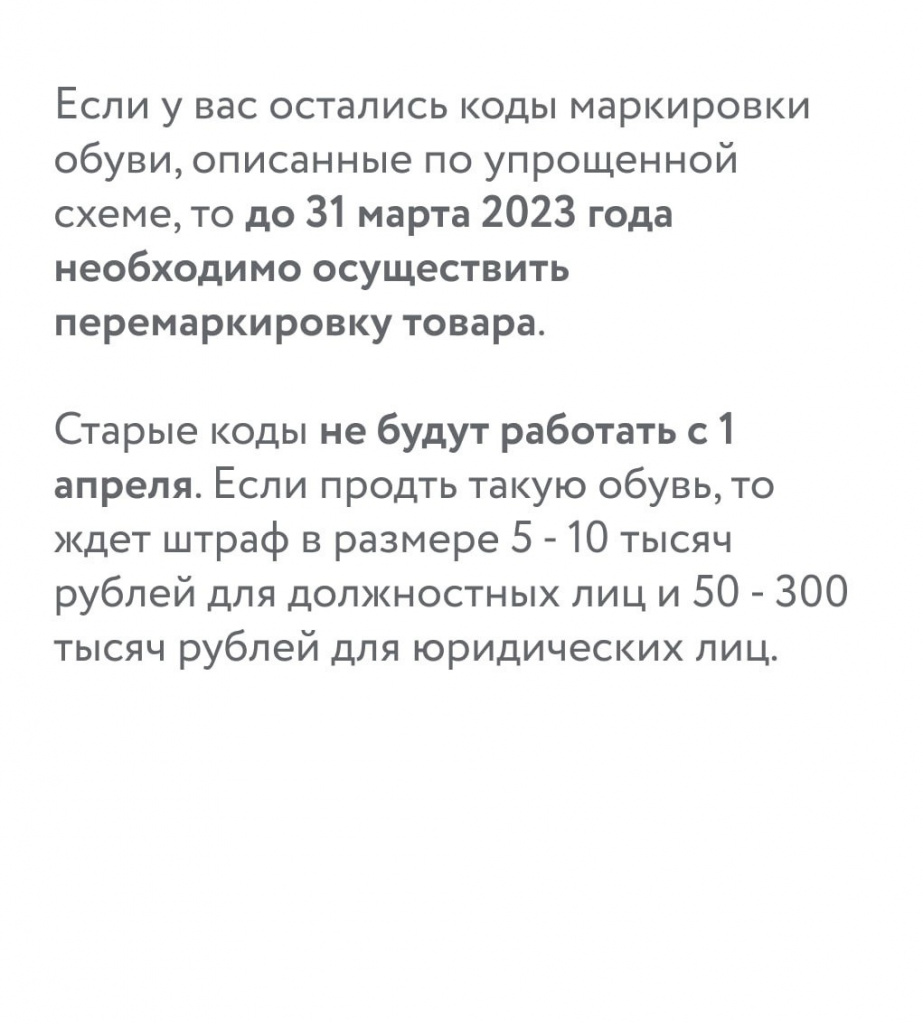 Кроме того, до 31 марта 2023 года необходимо перемаркировать обувные остатки или полностью их распродать (постановление Правительства РФ № 1861). Если не провести перемаркировку, коды маркировки указанной обуви аннулируются с 1 апреля 2023 года, и торговать обувью с упрощенными кодами маркировки будет нельзя (остатки обуви, которую ввели в оборот до 1 июля 2020 года и зарегистрировали ранее по упрощенной схеме).