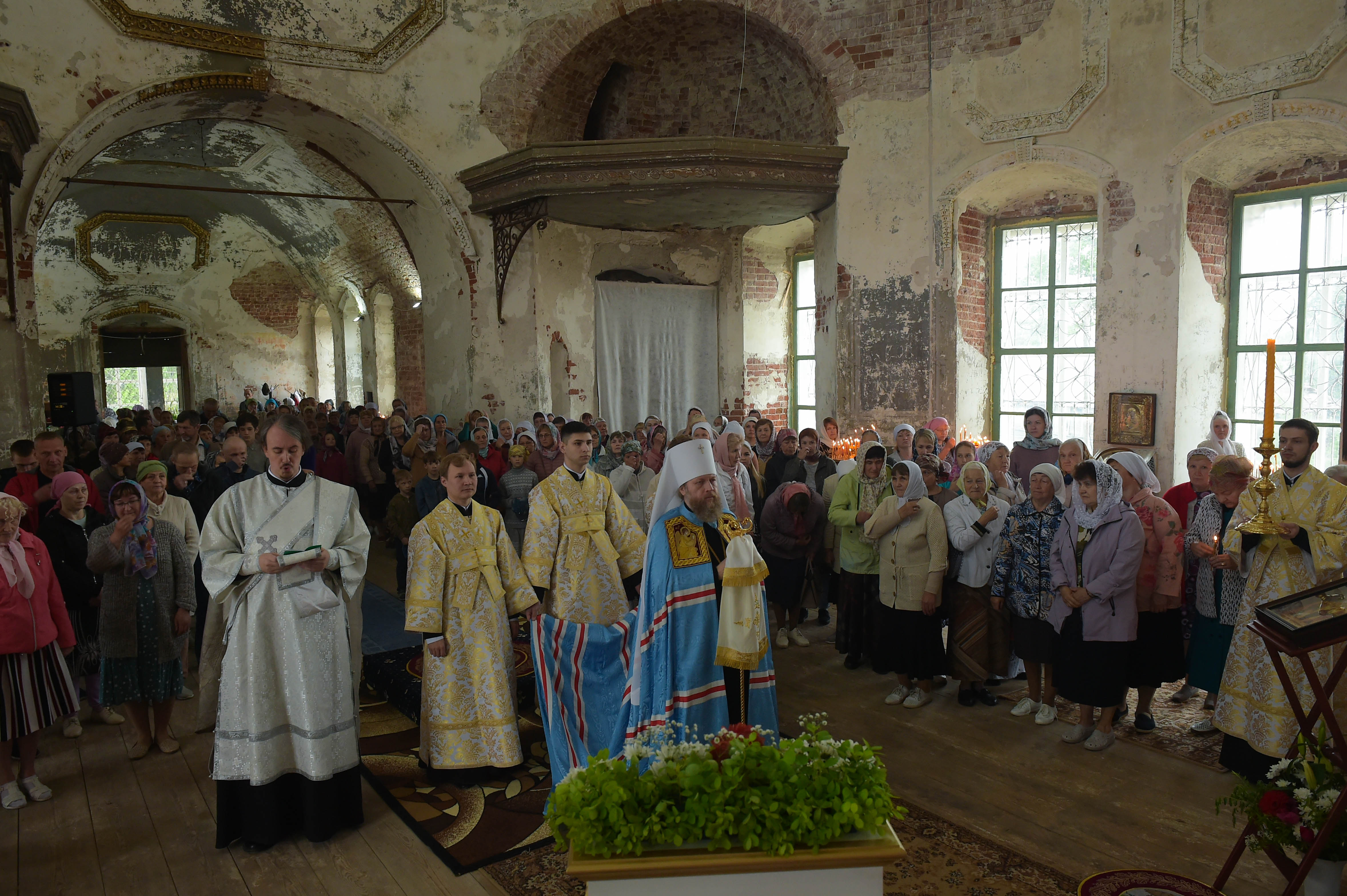 Чуть ранее в восстанавливающемся храме состоялось первое за сто лет архиерейское богослужение. Митрополит Вологодский и Кирилловский Савва совершил в верхнем храме Божественную литургию.