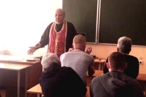 После ознакомительного обхода учреждения отец Андрей провел с осужденными беседу об основах христианской веры. Священнослужитель затронул вопросы нравственности, значения религии в жизни человека, семьи, общества, борьбы с греховными мыслями и поступками. В ходе беседы осужденные задавали вопросы о православных обычаях и обрядах, подготовке к ним, посещении храма, семейных отношениях и многом другом.