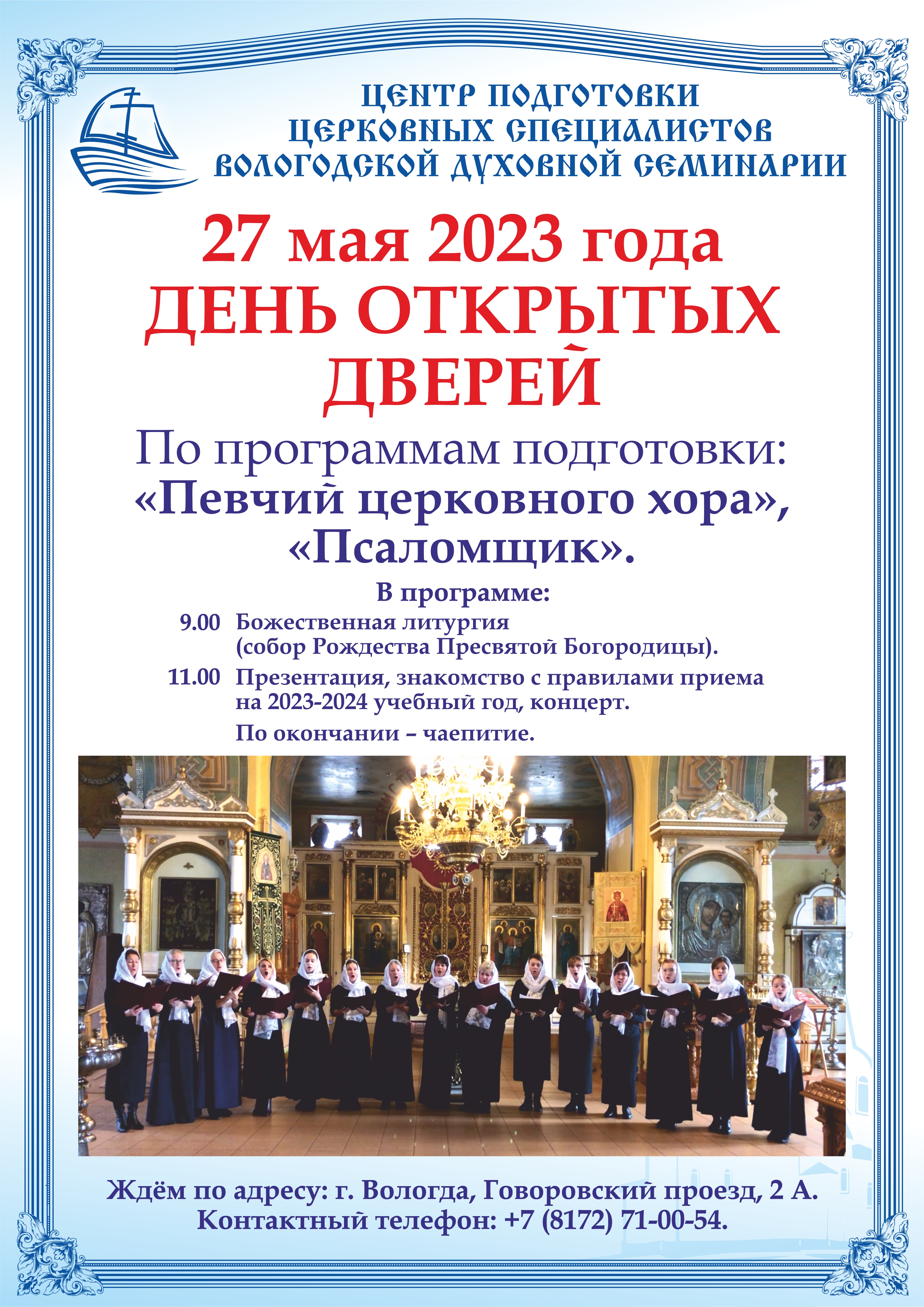 27 мая 2023 года Центр подготовки церковных специалистов Вологодской духовной семинарии распахнет свои двери для будущих абитуриентов певческого отделения.