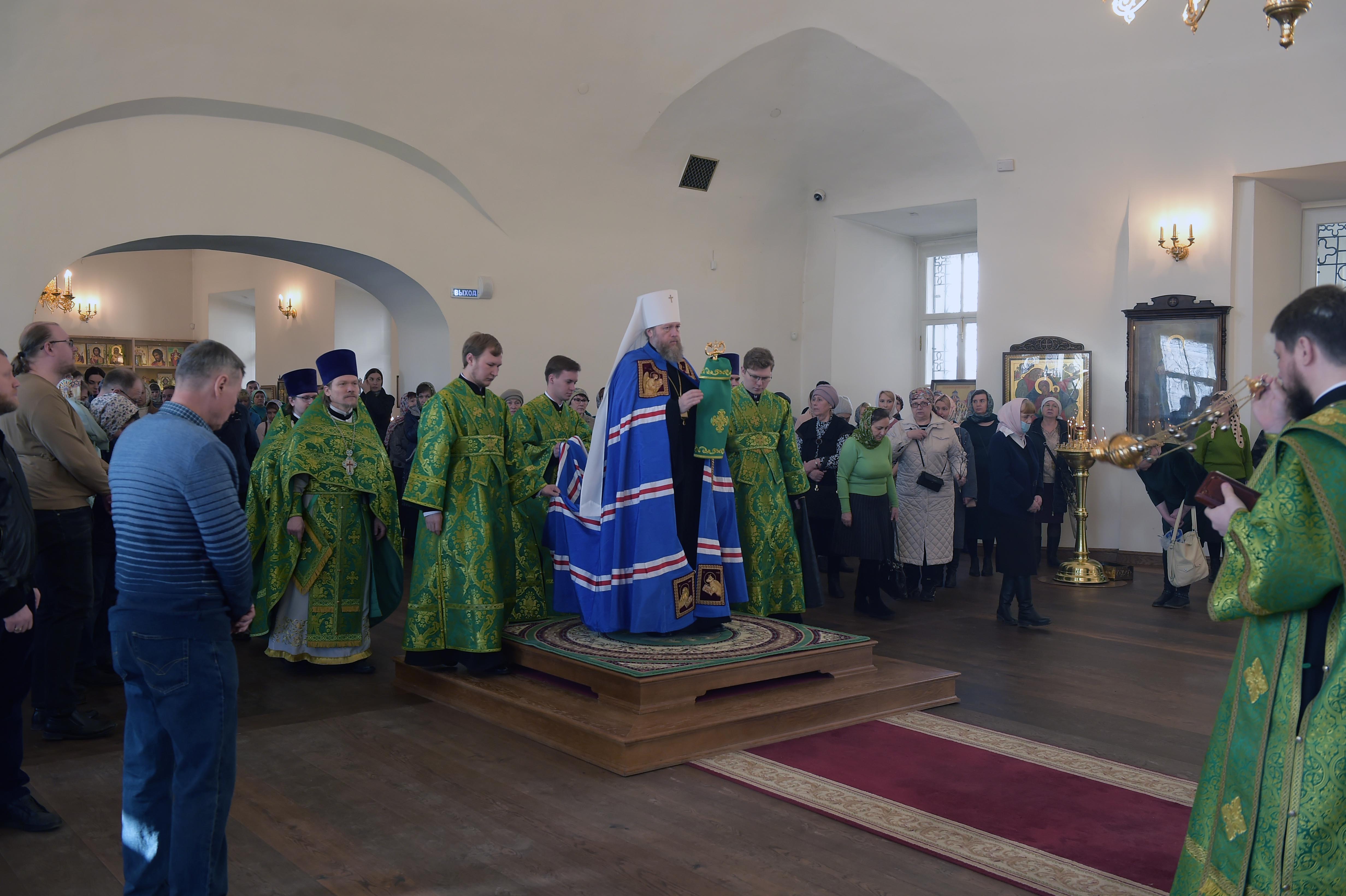 Высокопреосвященнейшему владыке сослужили: настоятель Воскресенского кафедрального собора протоиерей Андрей Смирнов , ключарь собора иерей Сергий Зяблицкий , руководитель Службы протокола Вологодской епархии иерей Андрей Кашинцев , клирики кафедрального собора иерей Артемий Денискин и иерей Виталий Макарявичус .