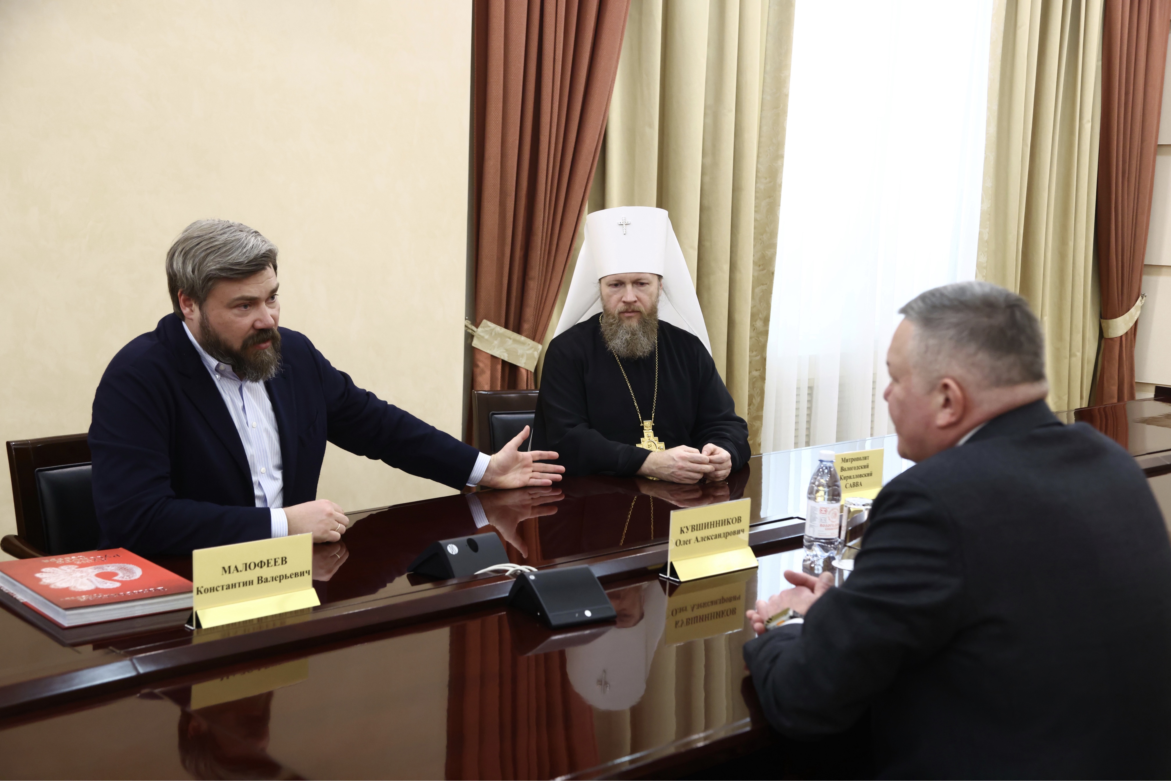 22 февраля 2023 года в здании Правительства Вологодской области состоялась встреча главы Вологодской митрополии митрополита Савва и заместителя главы Международной общественной организации «Всемирный Русский Народный Собор», председателя Общества «Царьград» Константина Малофеева с Губернатором области Олегом Александровичем Кувшинниковым.