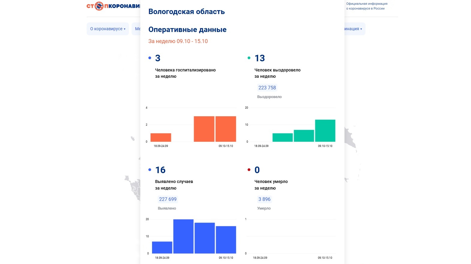В период с 9 по 15 октября в Вологодской области зафиксировано 16 случаев заболевания коронавирусной инфекцией.