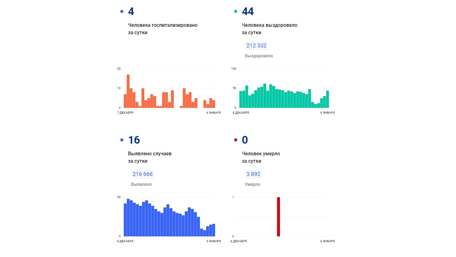 Кроме того, за минувшие сутки в Вологодской области выявлено 16 новых случаев заражения ковидом, 44 пациента выздоровели, умерших нет. Таковы данные портала «Стопкоронавирус.рф» на 6 января.