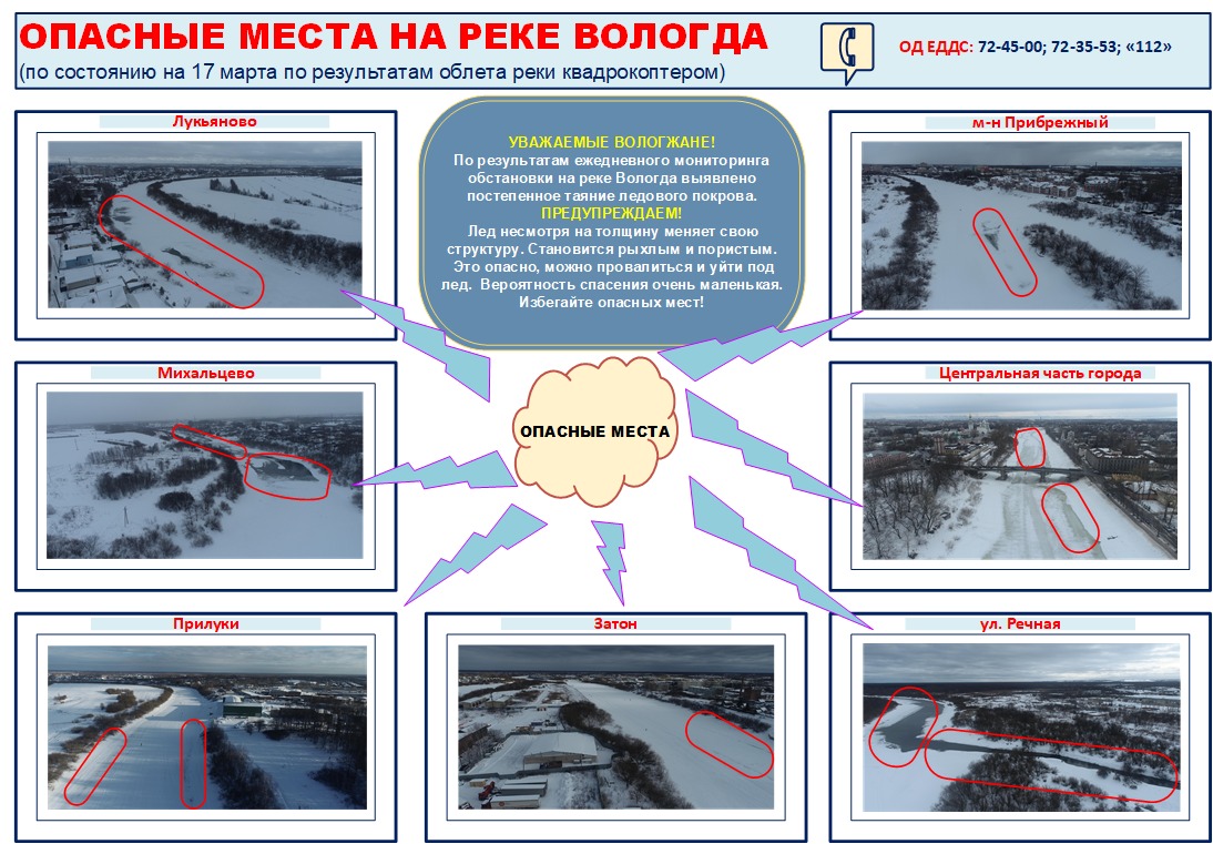 – Запрет выхода на лед в Вологде действует с 15 марта. Мы ежедневно проводим мониторинг ледовой обстановки на реке. Сейчас происходит активное таяние льда, он становится рыхлым, между слоями наблюдается вода. Ледовый покров уже не может выдержать вес человека. Открытые участки воды сейчас образовались на реке в Центральной части города и у микрорайона Прибрежный, в Лукьяново, Михальцево, Прилуках, Затоне и вблизи улицы Речная. Именно эти участки и нанесены на карту опасных мест, актуальную на данный момент. Карта будет актуализироваться еженедельно, – говорит Олег Пономарев, начальник Центра гражданской защиты населения города Вологды.