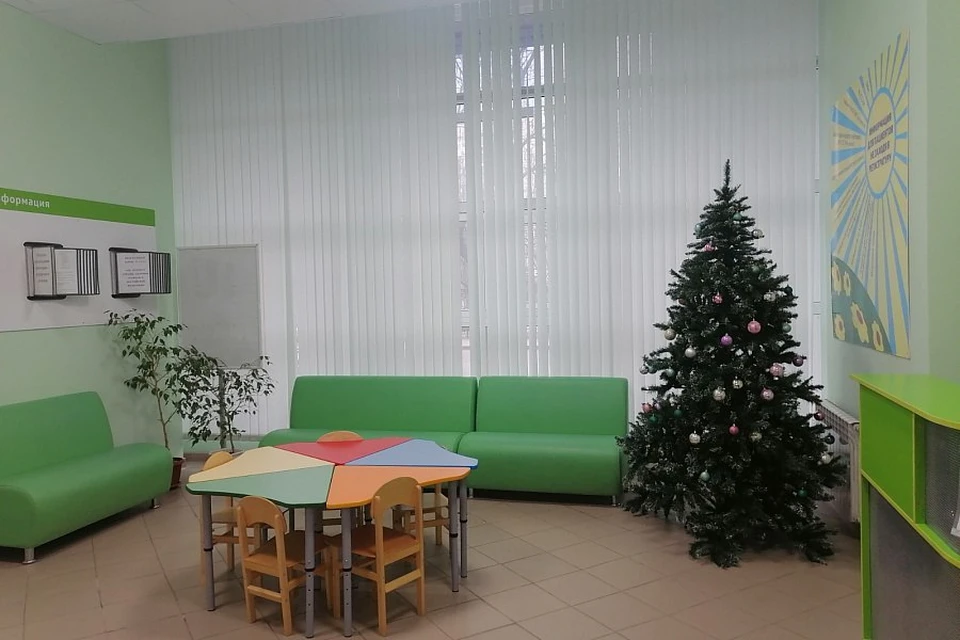 В холле уже украшена елка, организованы уголки для занятий детворы во время ожидания приема врача, стоят мягкие диваны.