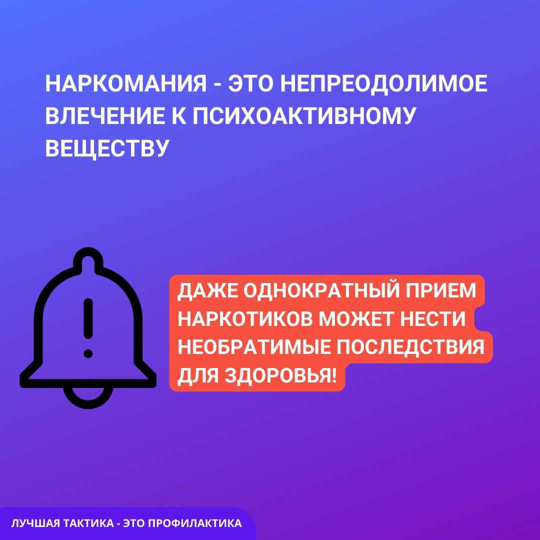 С 27 февраля по 5 марта Минздрав РФ проводит неделю профилактики употребления наркотических средств. Наркомания – это непреодолимое влечение к психоактивному веществу. Основной признак развития наркомании: привыкание к наркотику, необходимость увеличивать дозу и частоту приема, появление физической зависимости от наркотика – появление абстинентного синдрома, или «ломки», в отсутствие очередной дозы. Алкоголь и табак тоже относятся к психоактивным веществам, хоть юридически наркотиками не считаются. Наркотические и психоактивные вещества (ПАВ) оказывают выраженное токсическое действие на все структуры головного мозга. Под воздействием наркотика гибнут клетки жизненно важных отделов мозга: – Замедляются процессы передачи сигналов в межнейронном пространстве, что приводит к трудностям обработки и искажению восприятия информации. – Как следствие, нарушаются мышление, память, внимание скорость реакции. – На фоне употребления ПАВ развиваются тяжёлые психические и поведенческие расстройства, вплоть до полной деградации личности и слабоумия. Важно: даже однократный прием наркотиков может нести необратимые последствия для здоровья! Пресс-служба областного Центра общественного здоровья и медицинской профилактики