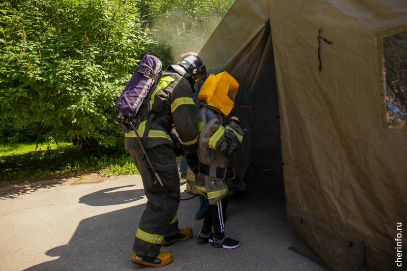 Сегодня в Комсомольском парке работали специальные интерактивные площадки. Юным череповчанам показали пожарную и спасательную технику, желающие могли примерить водолазный шлем и экипировку пожарных.