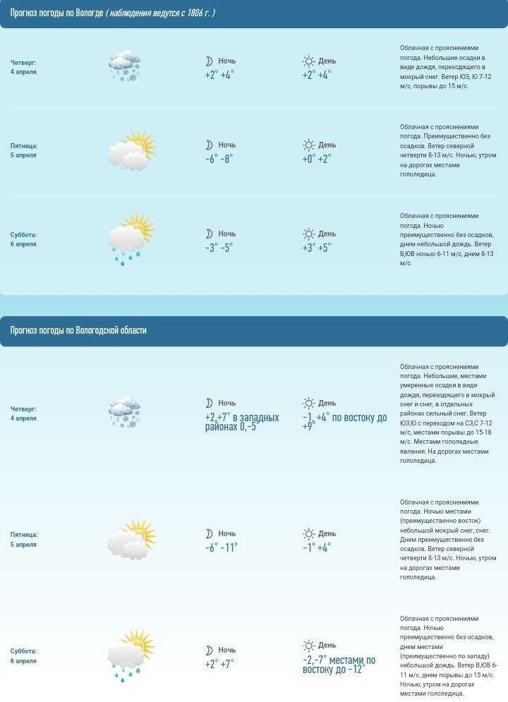 Уже в четверг, 4 апреля, температура воздуха на Вологодчине серьёзно понизится и станет колебаться до –1 до +4 градусов Цельсия. Лишь на востоке региона будет теплее – до +9 градусов Цельсия.