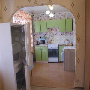 Сделана КУХНЯ-ГОСТИНАЯ. (Частично убрана стена между комнатой и кухней, но дверь из коридора на кухню сохранена)