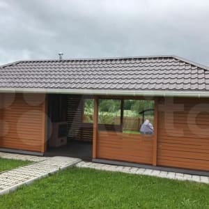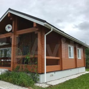 Внутри дома сауна финская из канадской сосны, душевая кабина, предбанник для отдыха после сауны. Зал -гостиная 40 метров, кухня, электролита, вытяжка, вся мебель остается. Две спальни, библиотека, санузел. Из дома можно выйти на терассу. По периметру датчики света. Электрощитовая вынесена на переднюю часть фасада дома.