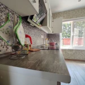 -полностью укомплектованная кухонная зона(плазменный телевизор,холодильник,микроволновая печь,плита,посуда).